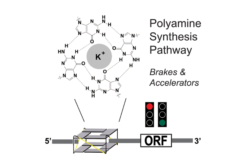 The group identified 35 putative G2-tract quadruplex structures in the 5’ and 3’ UTRs of genes in the polyamine (PA) biosynthesis pathway. Using cellular reporter assays they could identify twelve of these covering eight PA synthesis proteins that altered reporter activity in comparison to mutants. Strikingly, most of these structures had the effect to reduce PA levels. This suggested they might act in unison as regulatory elements to control PA homoeostasis.