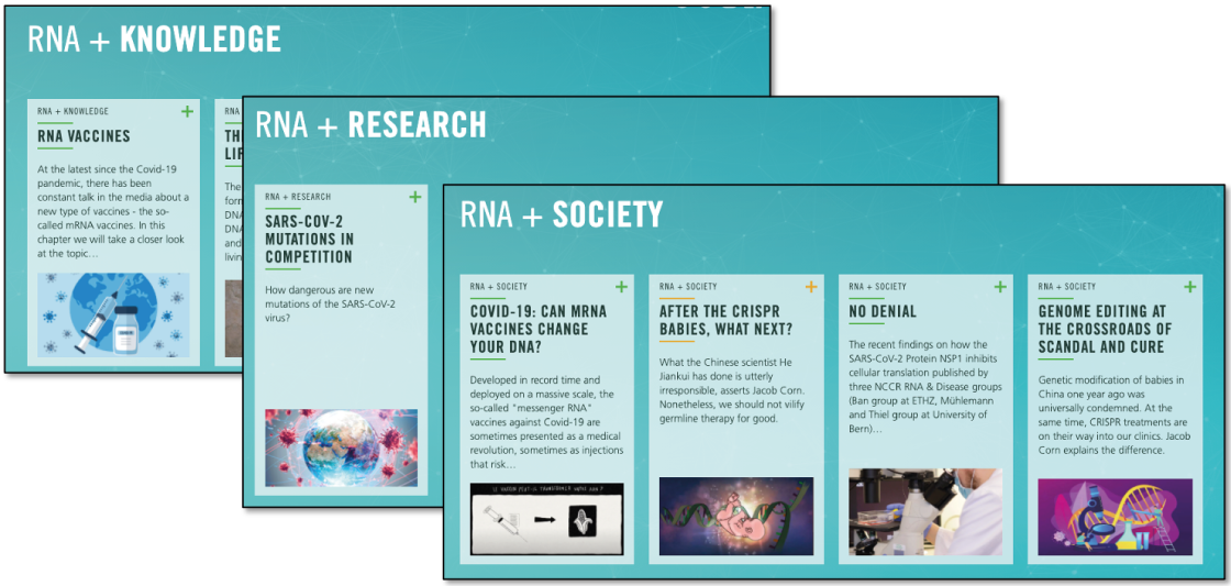 As a central new instrument for public communication, we have created MOLECOOL – COSMOS RNA. The trilingual website (German, French and English) serves to communicate knowledge and engage in a dialogue with the public. The content of the website is centered around the RNA molecule. It is regularly updated with contemporary articles about recent research highlights from NCCR labs, explanatory articles about RNA biology and articles covering societal discussions of RNA-related research findings. Together with the associated social media channels, the website aims to generate and satisfy genuine interest in basic research in the main target group - high school and university students and curious adults of any age.