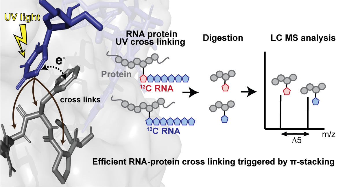 As a model system for cross-linking studies, the researchers turned to the RNA Recognition Motif (RRM) domain of the human splicing factor Fox-1 bound to its consensus heptanucleotide RNA binding motif. After UV irradiation and subsequent sample preparation, the cross-linked products were analyzed by mass spectrometry (MS) to pinpoint which amino acids of the RRM cross-link to which ribonucleotides. To precisely identify the cross-linking nucleotide, the RNA motifs were synthesized with different isotopic labelling schemes, in which one of the seven nucleotides was labelled with 13C atoms. The MS signal of a given cross-link comprising a labeled nucleotide shows a defined mass shift with that of an unlabelled equivalent, which allows for the unambiguous identification of the involved nucleotide.