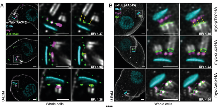 The Schneider lab in collaboration with the Ochsenreiter group (both University of Bern) researched how the mitocondrial DNA in trypansosomes is connected to the basal body of the flagellum, which occurs for mitochondrial genome segregation. They found that single molecules of the p197 protein spans over the distance and determines the spacing. Their findings have been published in the PNAS article " Single p197 molecules of the mitochondrial genome segregation system of Trypanosoma brucei determine the distance between basal body and outer membrane ".