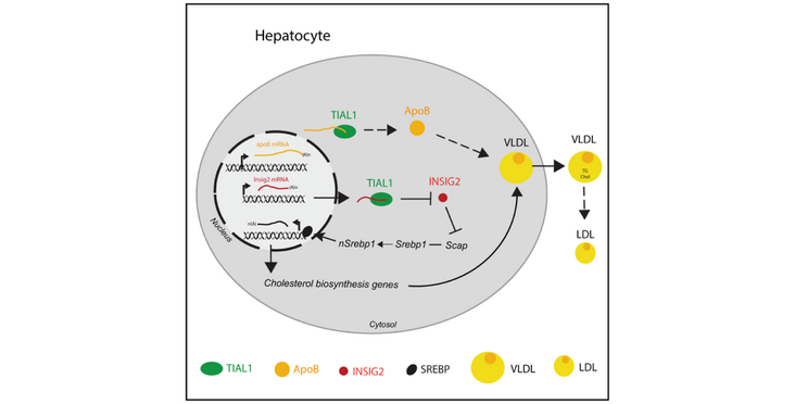 Researchers at IMHS developed viP-CLIP (in vivo PAR-CLIP), a method capable of identifying RBP targets in mammalian tissues, thereby facilitating the functional analysis of RBP-regulatory networks in vivo. By applying viP-CLIP to mouse livers, the investigators identified Insig2 and ApoB as prominent TIAL1 target transcripts, indicating an important role of TIAL1 in cholesterol synthesis and secretion. The functional relevance of these targets was confirmed by showing that TIAL1 influences their translation in hepatocytes. Mutant Tial1 mice exhibit altered cholesterol synthesis, APOB secretion and plasma cholesterol levels.