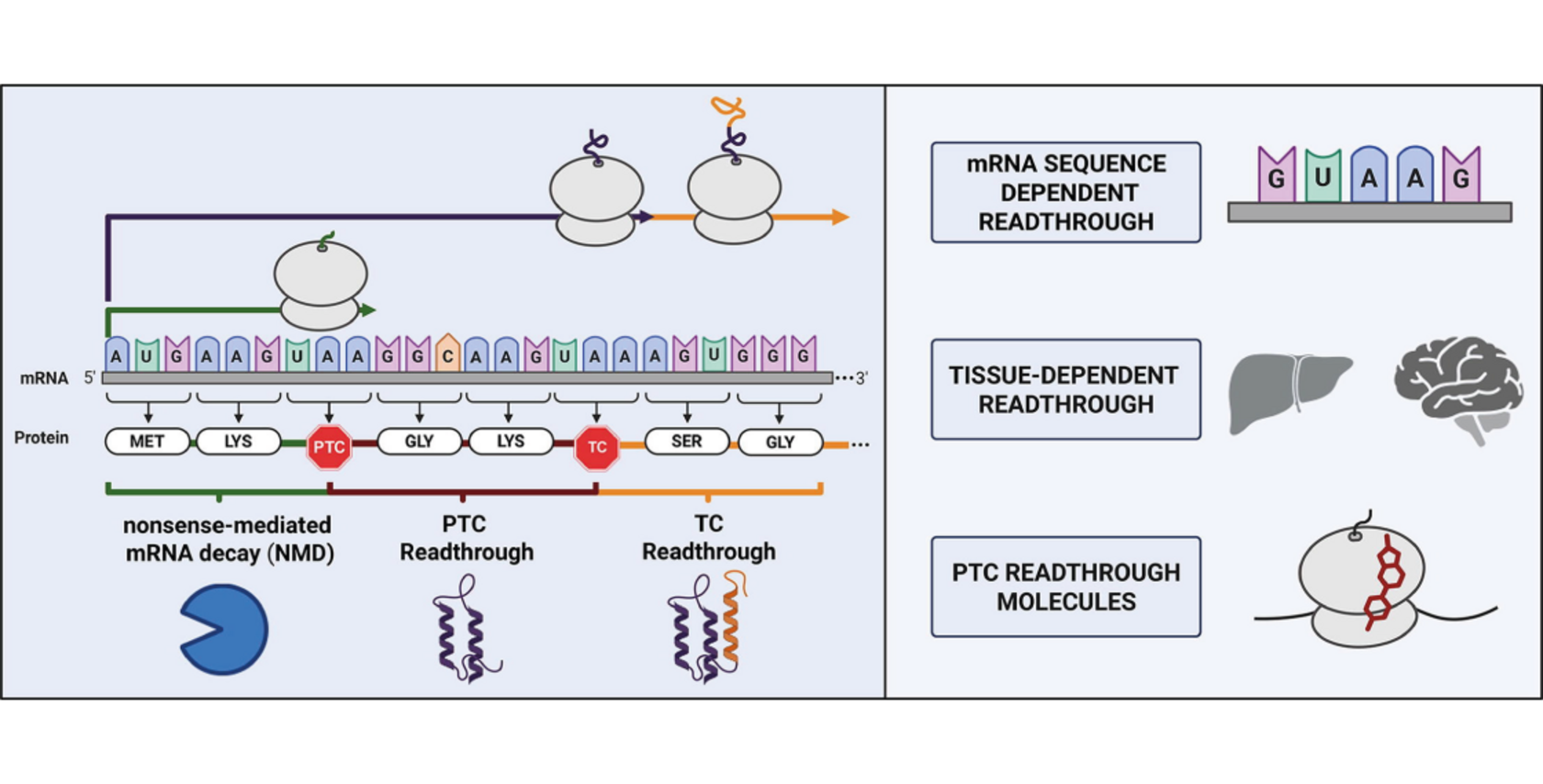 Translational readthrough, the process by which near-cognate tRNAs decode stop codons and allow ribosomes to continue elongation beyond the stop codon, represents a possibility to suppress PTCs and restore full-length protein synthesis. Initially discovered in viruses as a mechanism to expand coding capacity, readthrough is now recognized as a regulated feature of eukaryotic gene expression influenced by both cis-acting sequence elements and trans-acting factors. Recent evidence highlights the remarkable context dependence of readthrough, revealing variation across transcripts, tissues, and developmental stages.