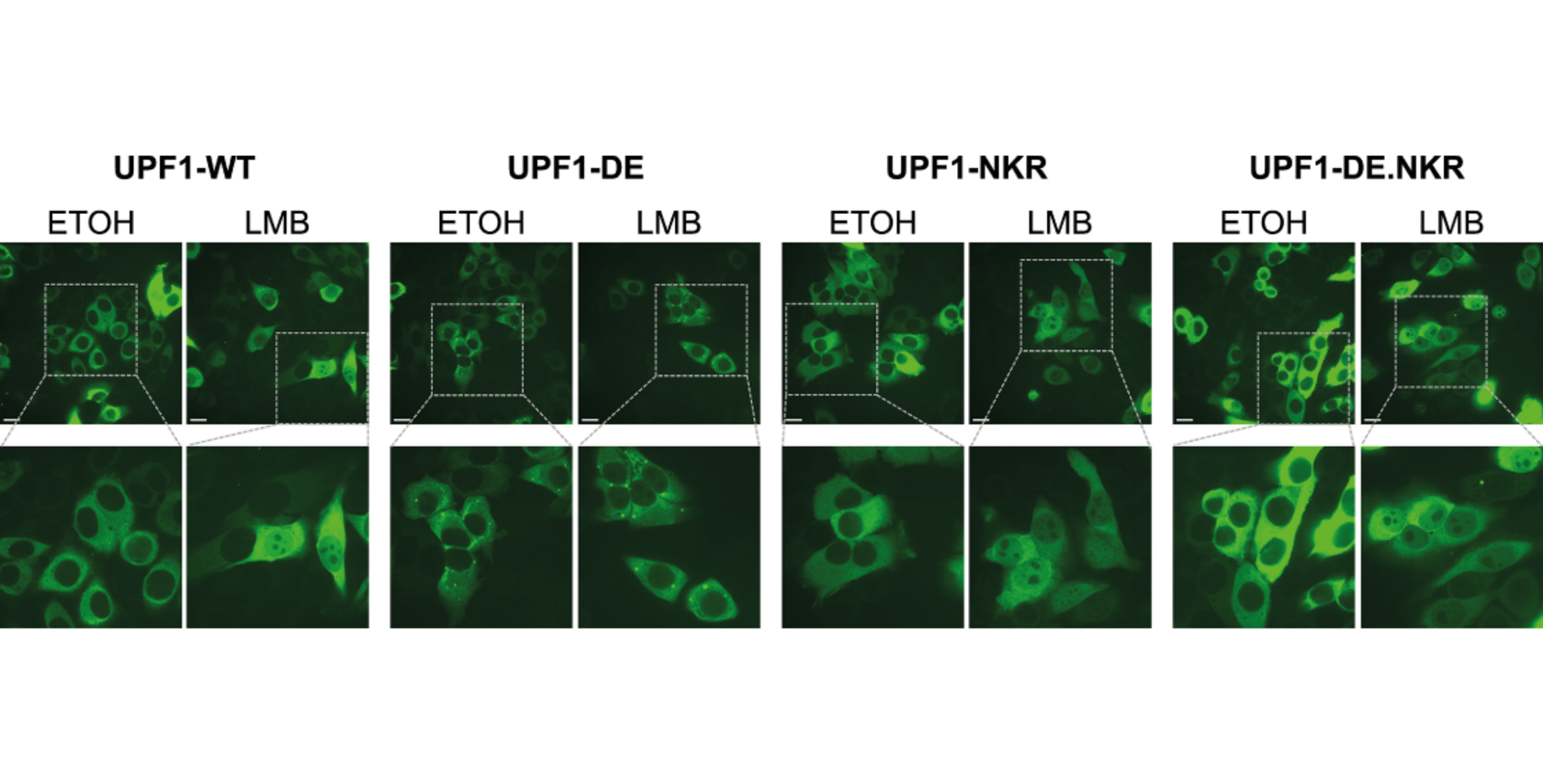 Up-frameshift 1 (UPF1) is an essential protein and key to Nonsense Mediated Decay (NMD). UPF1 is an ATP-dependent RNA helicase and was shown to shuttle between the cytoplasm and the nucleus, with most of the protein residing in the cytoplasm. The Mühlemann lab in collaboration with the Chakrabarti lab has investigated through the use of mutants if ATPase activity and RNA binding, respectively, are required for shuttling. Their experiments revealed that neither property is needed. Their findings have been published in the article “UPF1 shuttles between nucleus and cytoplasm independently of its RNA binding and ATPase activities” in the journal RNA.