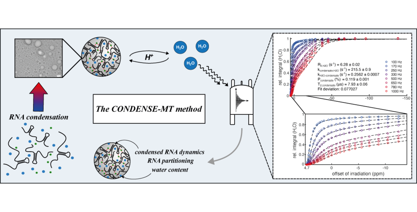 This paper in “Nature Chemistry” by the Allain Group (IBC) presents an NMR method to characterize condensates formed by disease-associated CAG-repeat RNA. The method uses water-detection, revealing that such condensates are semi-solid and contain less water when increasing the number of CAG repeats.