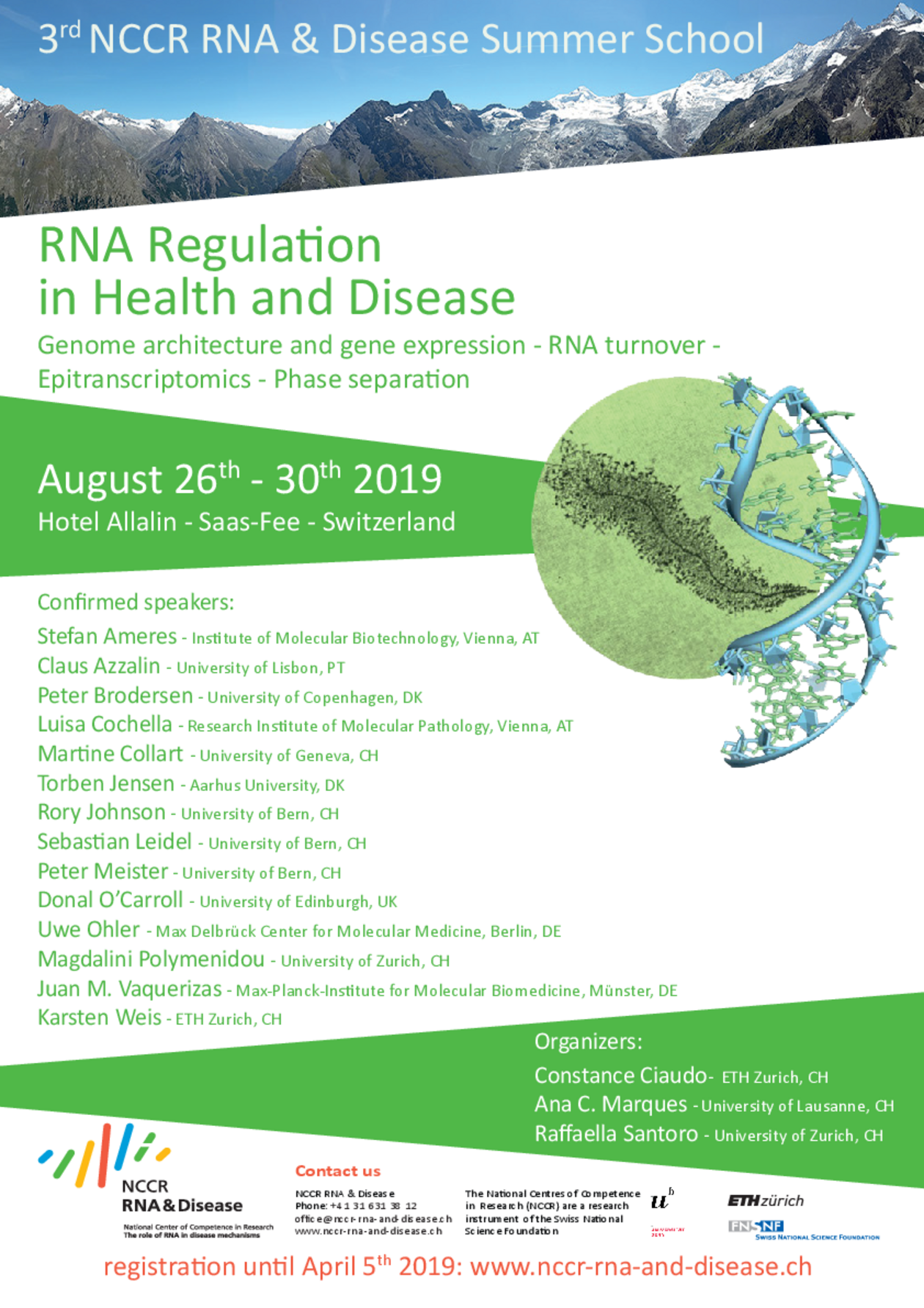 The 3rd NCCR RNA & Disease summer school "RNA Regulation in Health and Disease: Genome architecture and gene expression - RNA turnover - Epitranscriptomics - Phase separation" took place in Saas-Fee, Switzerland from August 26th to 30th 2019.