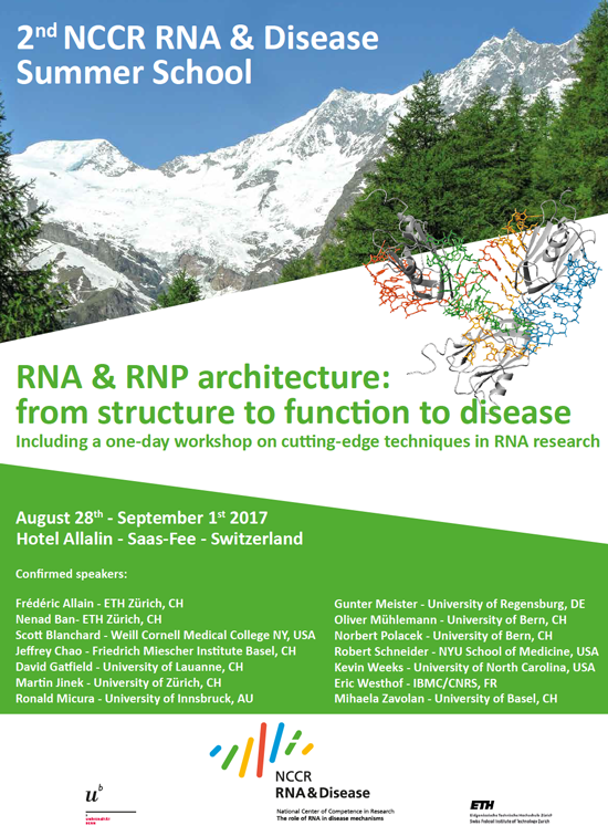 From August 28th to September 1st, 2017, the NCCR RNA & Disease organised its second Summer School in Saas-Fee, Switzerland. The five-day Summer School “RNA & RNP architecture: from structure to function to disease” allowed students and postdoctoral researchers to expand their knowledge in the field of RNA structure and its importance in function and disease. A one-day workshop dedicated to RNA techniques provided the unique opportunity for participants to gain deep insights into the state of the art methodologies in the field. The program consisted of keynote presentations from invited speakers, discussion groups and presentations from participating students and postdocs.